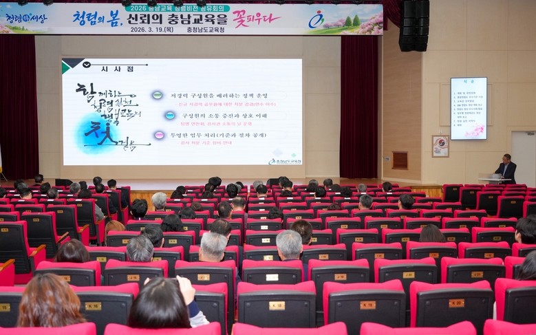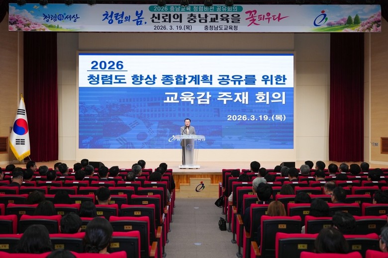이에, 19일(목) 충남교육청 대강당에서 도교육청 및 직속기관, 교육지원청 소속의 고위공직자와 청렴 업무 담당자 등 200여 명이 참석한 가운데 ‘2026 충남교육 청렴 비전 공유회의’를 개최했다.