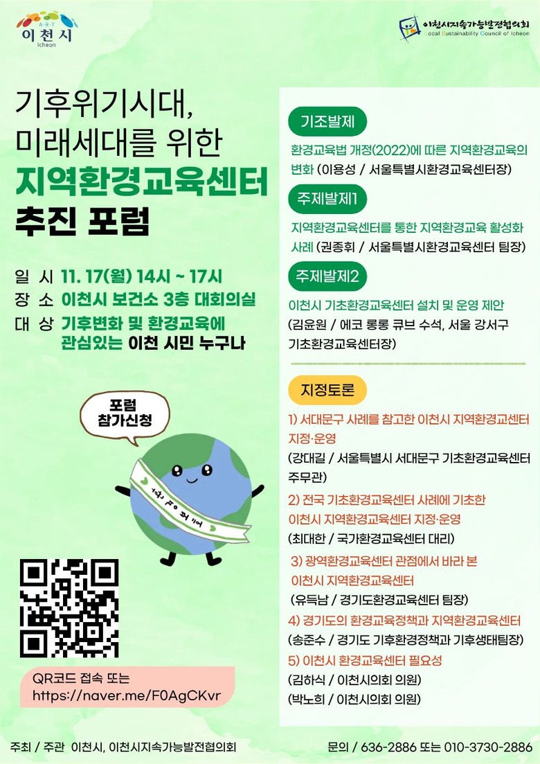 이번 포럼은 기후변화 대응과 지역 환경교육 활성화 방안을 논의하기 위해 마련된 자리로, 환경교육에 관심 있는 이천시민 누구나 참여할 수 있으며 네이버 폼(https://naver.me/FOAgCKvr)을 통해 사전 신청이 가능하다.