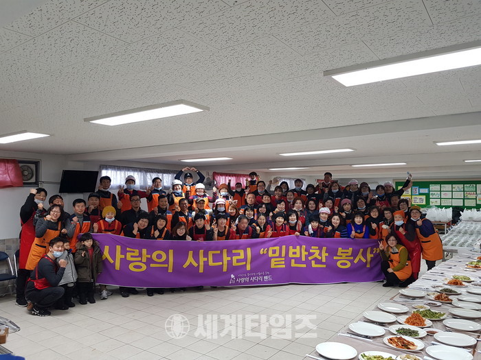 [대전=세계타임즈 이장성 기자] 추운겨울에도 사랑의 밑반찬 봉사로 따뜻한 이웃사랑을 전하는 6천명 봉사단체 사랑의 사다리 밴드(리더 이정제)는 13일 오전9시~오후1시 대덕구 오정동에 위치한 염광교회(담임목사 오상현)에서 대전시 소외계층 230명에게 사랑의 밑반찬을 직접 만들고 전달을 하면서 우리 사회의 훈훈한 정을 나누었다.