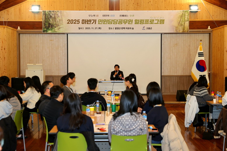 [고흥군 세계타임즈=우덕현 기자] 고흥군(군수 공영민)은 지난 27일 팔영산 편백 치유의 숲에서 실단과소 및 읍면 민원담당공무원 45명을 대상으로 힐링프로그램을 운영했다고 밝혔다.
