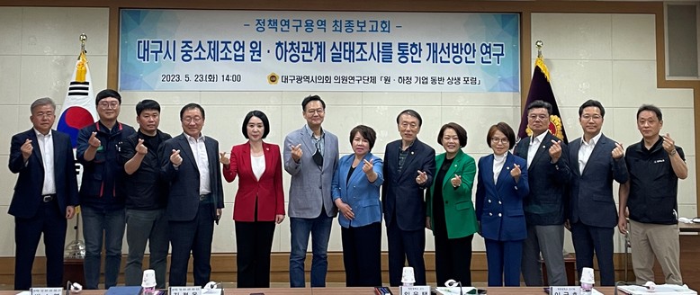 [대구 세계타임즈=한성국 기자] 대구광역시의회 의원연구단체 「원·하청 기업 동반 상생 포럼」(대표 김정옥 의원)은 5월 23일(화) 오후 14시 시의회 3층 회의실에서 소속 의원(대표 김정옥, 간사 박소영, 류종우, 황순자, 하병문, 이태손, 윤권근, 박종필, 허시영, 이영애, 김원규)이 참석한 가운데 정책연구용역 최종보고회를 개최했다.