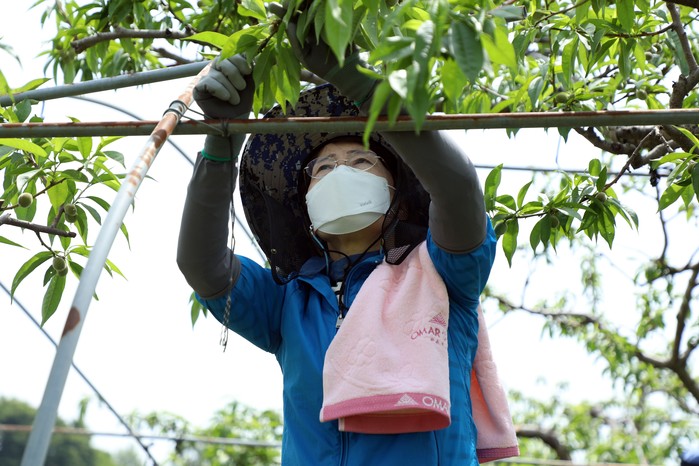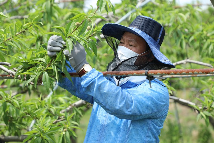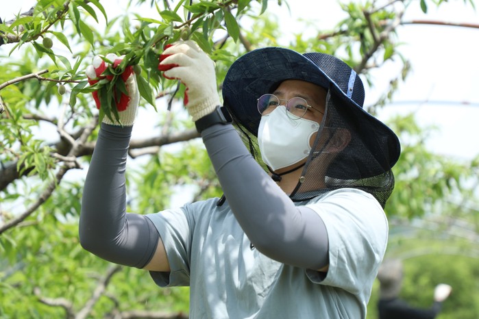 봉사활동 참가자들은 복숭아 농장주와 함께 복숭아 열매솎기 작업을 진행하며 농번기를 맞아 일손이 부족한 농가에 힘을 보탰다.