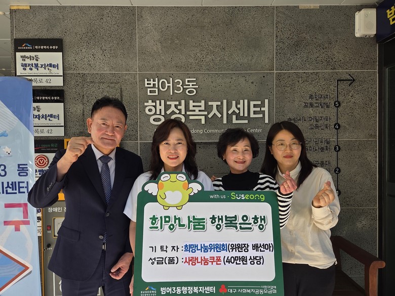 [수성구 세계타임즈=한윤석 기자] 대구 수성구 범어3동 희망나눔위원회(위원장 배선아)는 지난 2일 어린이날을 맞아 지역의 취약계층 아동을 위해 치킨 등 간식을 구입할 수 있는 ‘사랑나눔쿠폰’(40만 원 상당)을 범어3동 행정복지센터(동장 정병준)에 기탁했다.