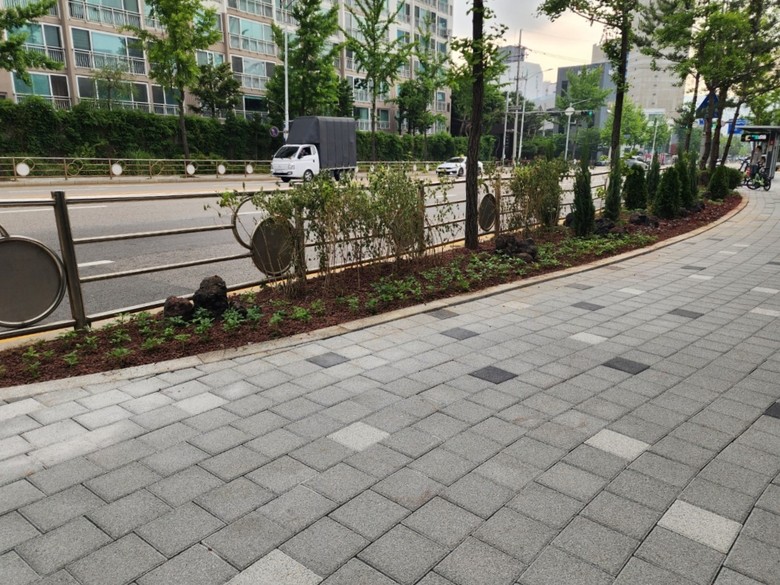 구는 또, 용인시 교통약자이동편의시설기술지원센터와 협의해 교통약자를 위한 점자블록과 보행자 안전지대도 설치했으며, 단조로운 보행환경의 미관을 개선하기 위해 적엽휴케라, 백리향, 라임라이트, 블루엔젤 등을 식재해 포켓정원을 조성했다.