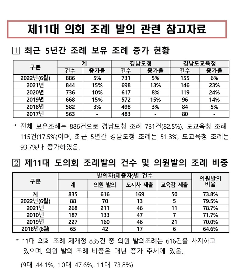 ► 경남도의회는 2022년 10월 구성된 조례정비특별위원회(이하 ‘조례특위’라 한다)가 그간 5차례의 회의를 거쳐, 지난 7월 임시회에서 171건의 조례를 개정・폐지하여, 이 건수를 반영할 수 있었음에도 고려하지 않았다.