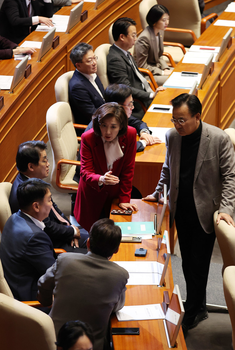 [세계타임즈 = 심귀영 기자] 국민의힘 나경원 의원이 10일 오후 국회 본회의장에서 동료 의원들과 대화하고 있다. 2024.12.10