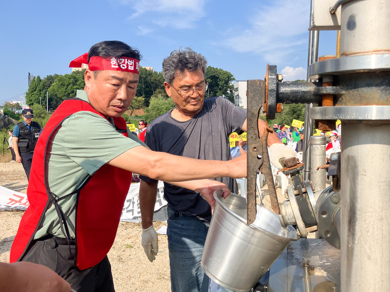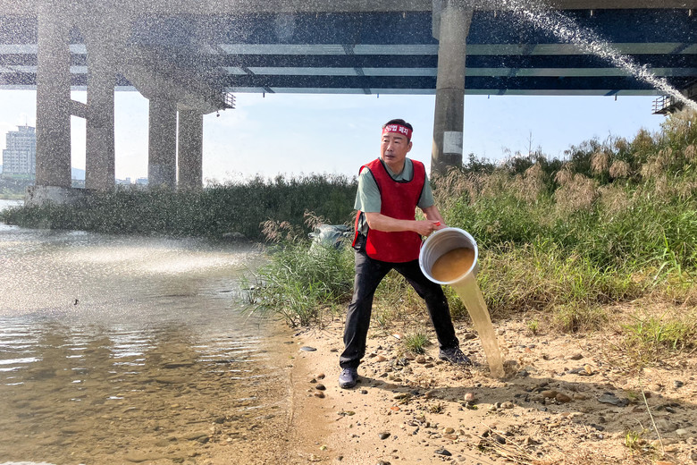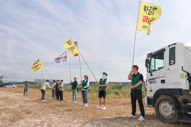현장에서는 규제 철폐를 상징하는 ‘흙탕물 살포 퍼포먼스’가 진행되었으며, 시민들은 노란 피켓을 들고 “한강법 폐지”를 외치며 결집된 의지를 드러내었다.