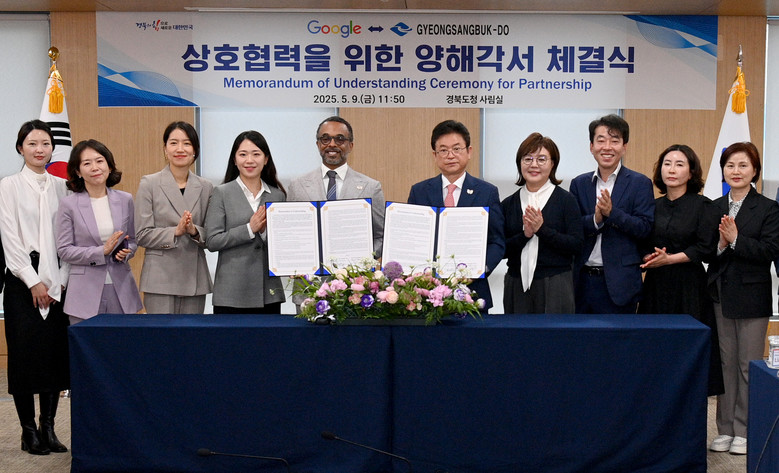 경상북도와 구글은 9일 도청에서 이철우 도지사, 양금희 경제부지사, 크리스 터너 구글 글로벌 부사장, 황성혜 구글코리아 부사장 등이 참석한 가운데 ‘상호협력체계 구축을 위한 양해각서 체결식’을 개최하고, 앞으로 지속적인 파트너십 구축에 합의했다.