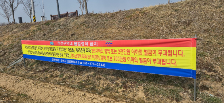 [안성시 세계타임즈=송민수 기자] 안성시가 하천구역 내 불법 점용 행위를 뿌리 뽑고 무단 경작을 예방하기 위해 관내 지방하천 일대에 ‘경작 금지’ 홍보 현수막을 설치하고 집중 점검에 나섰다.