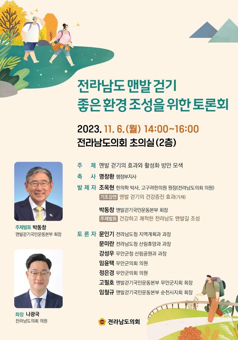박동창 맨발걷기국민운동본부 회장이 맨발 걷기 체험 사례를 발표하고, 한의사 면허를 가진 조옥현 도의원(전라남도의회 교육위원장)이 한의학적 관점에서 맨발 걷기의 건강증진 효과에 대해 강연한다.