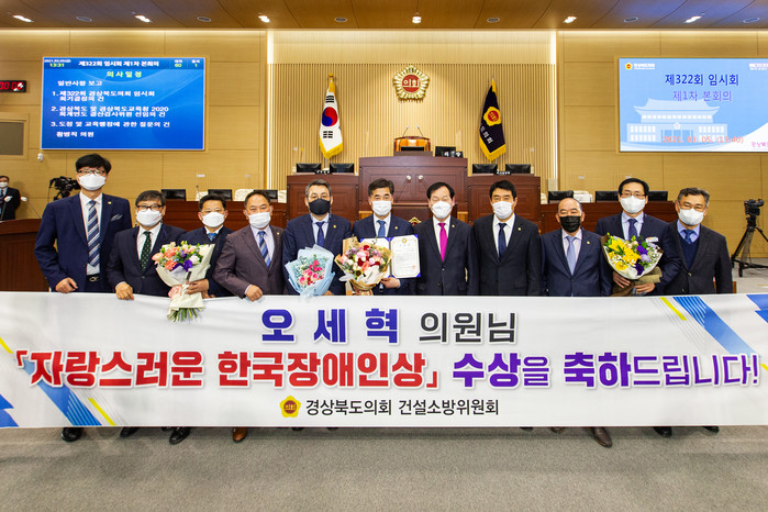 [경북=세계타임즈 한성국 기자] 경북도의회 건설소방위원회 오세혁 의원(경산4)이 평소 장애가 있는 이웃들의 불편해소와 복리증진을 위해 노력해온 공적으로 자랑스러운 한국장애인상을 수상했다고 밝혔다.