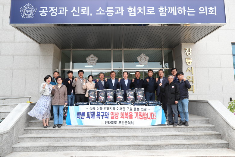 부안군의회는 최근 강릉 산불로 인한 피해를 입은 이재민들을 위해 피해 복구에 조금이나마 힘을 보태고자 하였으며, 품질 좋고 밥맛 좋은 부안 쌀이 이재민 분들에게 조금이나마 도움이 되기를 바란다고 밝혔다.