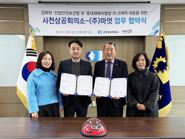[사천시 세계타임즈=최성룡 기자] 사천상공회의소(회장 황태부)는 지난 27일 ㈜마엇과 ′디지털 위험성평가 시스템′ 구축지원 업무협약을 체결했다고 28일 밝혔다.