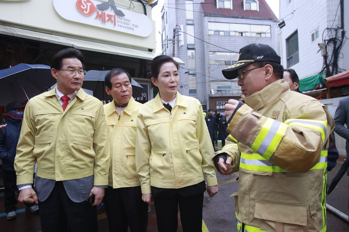 [대구=세계타임즈 한성국 기자] 대구광역시의회 배지숙 의장과 장상수 부의장, 김규학 의원(자유한국당 대구시의회 원내대표) 등은 대보빌딩 대보사우나 화재현장을 방문하여 소방관계자로부터 화재수습 상황을 보고받고 관계자들의 노고를 격려했다.