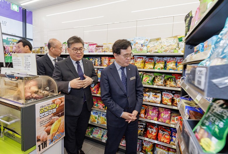 | ▲ 진교훈 서울 강서구청장(오른쪽)이 시니어 편의점 한아름상점(이음가게 1호점) 개소식에 참석해 편의점 내부를 둘러보고 있다. |