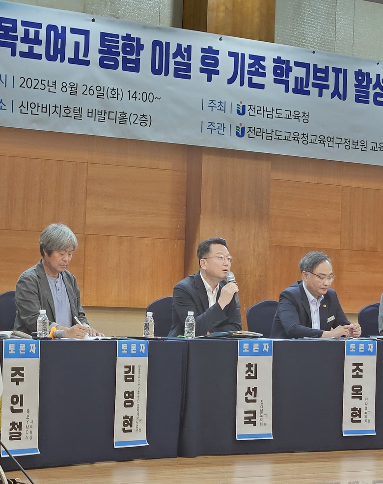 [전남 세계타임즈=우덕현 기자] 전라남도의회 최선국 의원(더불어민주당·목포1)은 지난 8월 26일 개최된 ‘목포고·목포여고 통합 이설 후 기존 학교부지 활성화 방안 전문가 토론회’에서 기존 학교부지의 공공적 활용을 위한 전략적 방향을 제시하며, “목포 원도심의 정체성과 지역 공동체의 미래가 달린 핵심 과제”임을 강조했다.