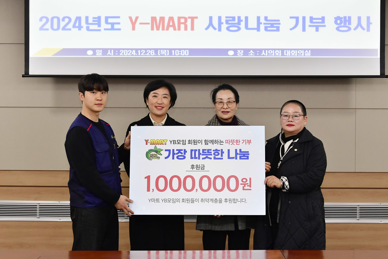 시의회에 따르면 ‘Y-MART YB모임회(회장 김찬혁)’에서 주변의 어려운 이웃들이 따뜻한 연말을 보내길 기원하며, 시의회 및 자치구 의회에서 연계해준 사회복지단체에 Y-MART 모든 점포에서 사용할 수 있는 상품권 500만원 상당을 전달했다.