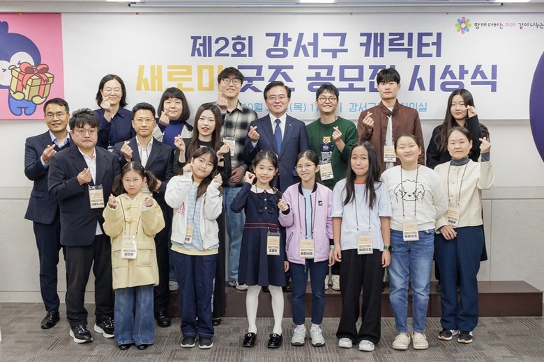 | ▲ 진교훈 서울 강서구청장(뒷줄 오른쪽 네 번째)이 30일(목) 구청 대회의실에서 열린 제2회 강서구 캐릭터 새로미 공모전 시상식‘에서 수상자들과 기념촬영을 하고 있다. |