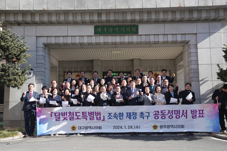 광주광역시의회(정무창 의장)와 대구광역시의회(이만규 의장) 의원들은 24일(수) 오후 2시 대구광역시의회에서 ‘달빛철도 특별법 조속한 제정’을 촉구하는 공동성명을 발표했다.