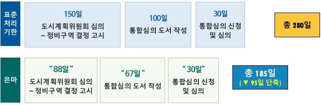 은마아파트 재건축은 ‘신속통합기획 시즌2’에 따라 ① 통합심의 전 진행하던 환경영향평가 초안검토회의를 생략하였고, ② 자치구·조합 및 분야별 업체들과 지속적인 소통과 공정 회의를 통해 각종 행정 준비절차를 사전에 병행 추진하는 등 절차 간소화 및 적극적 공정관리를 실시하였다. 그 결과, 정비사업 단계별 표준처리기한에 대비해 사업기간을 약 3개월 단축할 수 있었다.