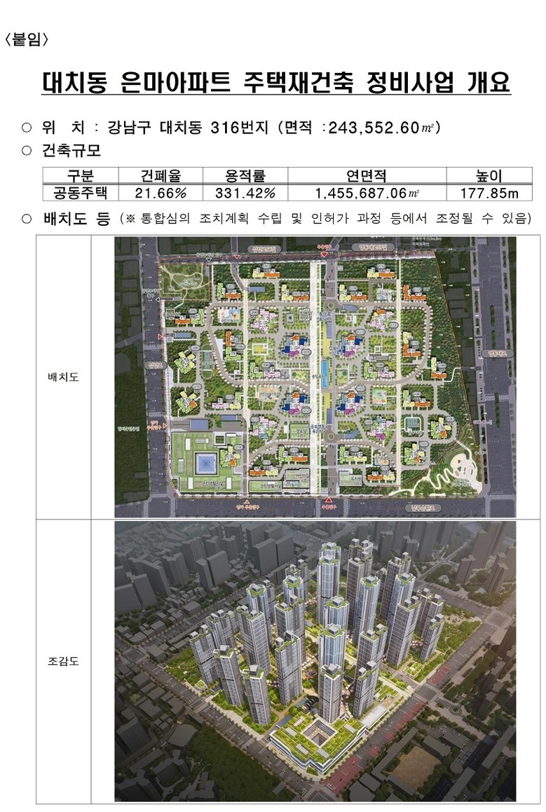 은마아파트 재건축은 대치동 학원가(은마아파트입구 사거리)와 학여울역 주변 등 2개소에 지역 주민을 위한 공원을 조성하여 대단지 공급과 함께 지역 주거환경도 개선한다.