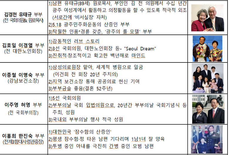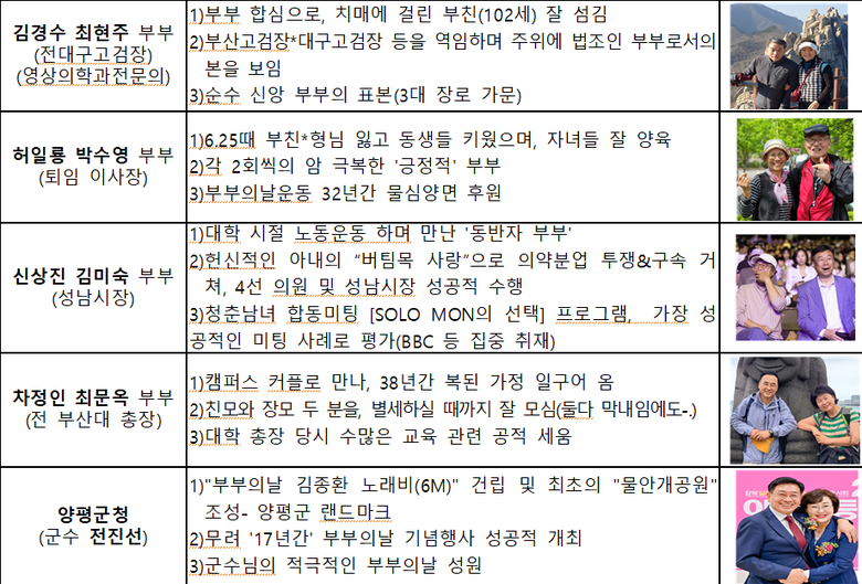 아래는 수상자 명단(총 20팀) △김경천 전 국회의원&유태규 원로목사 부부, △김호일 전 대한노인회장&이경열 여사 부부, △이종철 강남보건소장&이명숙 여사 부부, △이주영 전 국회부의장&허영 여사 부부, △이홍희 전 제3함대사령관중장&한진숙 여사 부부, △김경수 전 대구고검장&최현주 여사(영상의학과 전문의) 부부, △허일룡 퇴임 이사장&박수영 여사 부부, △신상진 성남시장&김미숙 여사 부부, △차정인 전 부산대 총장&최문옥 여사 부부, △이종호 36대 해군 참모총장(대장)&양인숙 부부, △박주경 전 육군 참모차장(중장)&이경임 여사 부부, △조현배 전 해양경찰청장&이귀선 여사 부부, △김영훈 전 을지대 교수&한정미 여사 부부, △신형수 평화노인대학장&박정자 여사 부부, △부부의날 공식홍보대사 가수 김종환&김민주 여사 부부, △표창수 장성 육군보병학교장(소장)&정혜경 여사 부부, △여섯 동생 양육 우정민&박원제 씨 부부, △양팔 없는 마라토너 김황태&김진희 씨 부부, △아제르바이잔 라힐&이경덕 씨 부부. △양평군청(군수 전진선) 지자체 선정.