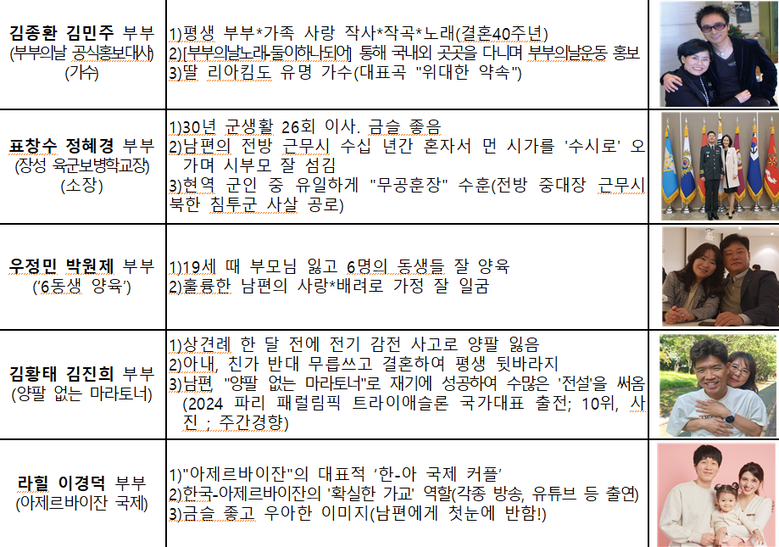 인천 모범부부에 선정된 김황태·김진희 부부는 ‘양팔 없는 마라토너’로 알려진 감동의 주인공이다. 두 부부는 결혼 전 한차례 위기를 겪었다. 상견례 한 달 전 감전 사고로 김황태 씨가 두 팔을 잃게 됐다. 그러한 위기의 상황에서도 김황태 씨와의 결혼을 택한 아내는 평생을 헌신하며 동행했고, 김황태 씨는 2024 파리 패럴림픽 철인 3종 경기 국가대표로 완주에 성공하며 희망의 상징이 되었다.