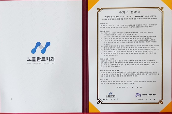노블란트치과 정성우 원장은 “매월 다양한 봉사활동으로 우리 사회에 귀감이 되고 있는 사랑의 사다리 밴드 봉사단체와 오늘 업무협약식을 통해서 지역사회를 위해서 따뜻한 나눔을 실천하겠다.”고 말했다.