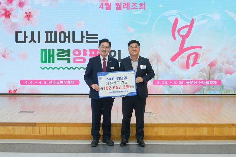 [양평군 세계타임즈=송민수 기자] 양평군(군수 전진선)은 지난 4월 1일 NH농협은행 양평군지부로부터 제휴카드 적립기금 1억 256만 원을 기금 수입금으로 전달받았다고 밝혔다.