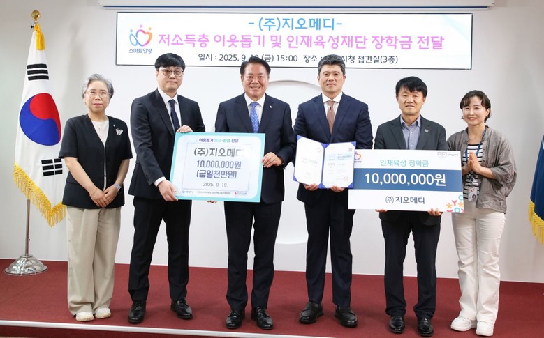 이에 대해 이병준 안양시인재육성재단 대표이사는 “㈜지오메디의 따뜻한 나눔이 저소득층과 미래 인재들에게 큰 힘이 될 것”이라며 “전달된 성금은 장학사업과 복지 지원에 소중히 사용하겠다”고 감사의 뜻을 전했다.