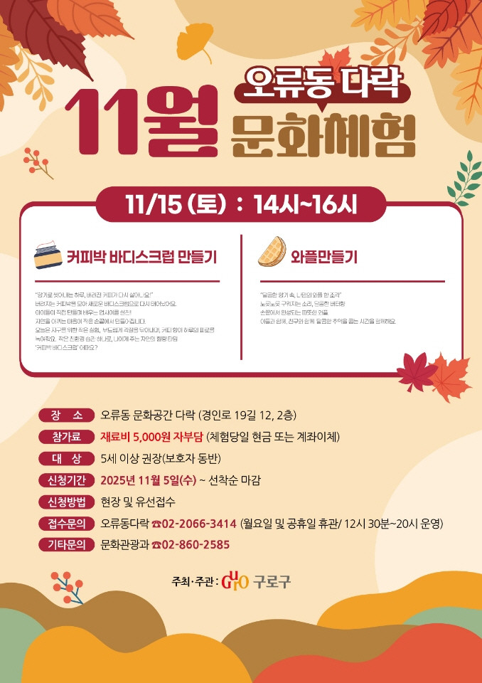 또한, 신도림 다락(11월 22일)과 오류동 다락(11월 15일)에서 각각 ‘커피박 바디스크럽 만들기’와 ‘와플 만들기’ 체험 프로그램이 진행된다.