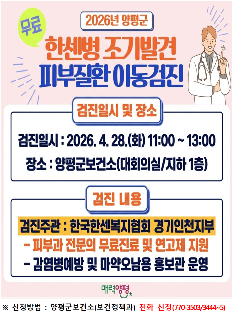 양평군, 한센병 조기 발견 ‘피부질환 무료 이동검진’ 사전 접수 시작