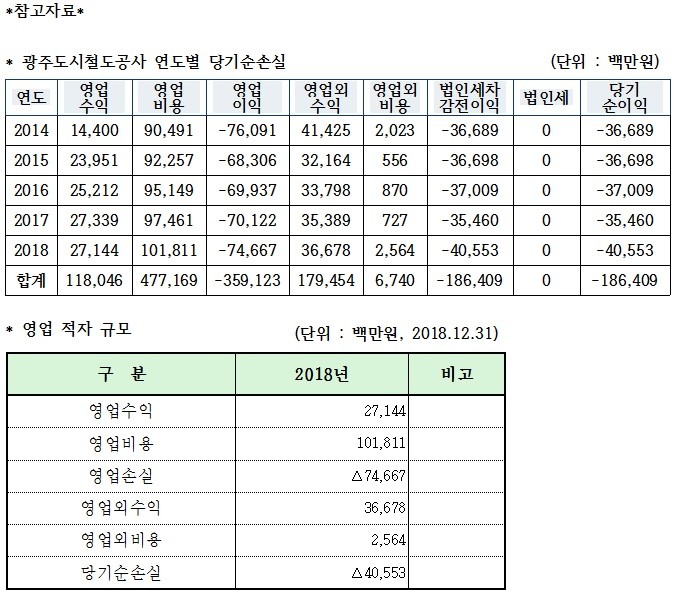 광주도시철도가 제출한 자료에 따르면 당기순손실은 2014년~2015년 367억원, 2016년 370억원, 2017년 355억원, 2018년 406억원으로 매년 상승하고 있으며 2018년 영업비용은 약1000억원에 비해 수익은 약270억원이며, 영업손실은 약746억원으로 집계됐다.