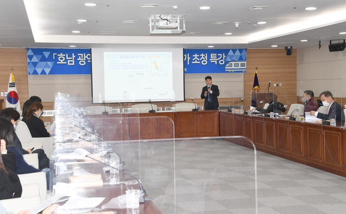 김준하 처장은 특강에서 “광주와 전남‧북의 500만 광역경제권 그랜드 비전을 실현하여 새로운 호남으로 도약하기 위해서는 3개 광역지자체를 연결하는 광역교통망 확충이 필히 선행돼야 한다”고 말했다.