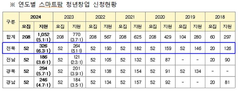 [전북특별자치도=세계타임즈 이상호 기자] 전북특별자치도 농식품인력개발원은(원장 이태수) 지난 5월 20일부터 6월 20일까지 스마트팜을 이끌어갈 청년창업 농업인 양성을 위한 「스마트팜 청년창업 7기 교육생 52명 모집」에 7년 연속 전국 1위를 유지하면서 역대 최대‧최고인 총 326명이 지원하여, 6.3:1의 경쟁률을 기록하였다고 밝혔다.