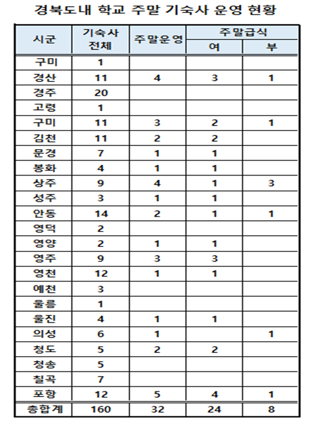 또한, “예를 들어, 울릉도 학생들은 주말에 집으로 돌아갈 수도 없고 학부모가 나올 수 있는 여건도 안된다. 그 외에도 집으로 돌아갈 여건이 안되는 학생이 주말에 기숙사 운영도 안하고 급식도 하지 않은 경우 자칫 위험에 처할 수 있으니 학생 보호 차원에서 교육청의 세심한 배려가 필요하다”라면서 교육청의 전반적인 실태조사를 촉구했다.