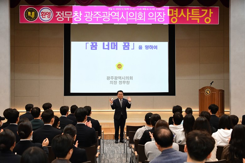 [광주 세계타임즈=손권일 기자] 광주광역시의회 정무창 의장은 19일 호남대학교 도서관 국제회의실에서 ‘꿈 너머 꿈을 향하여’를 주제로 특강을 했다.
