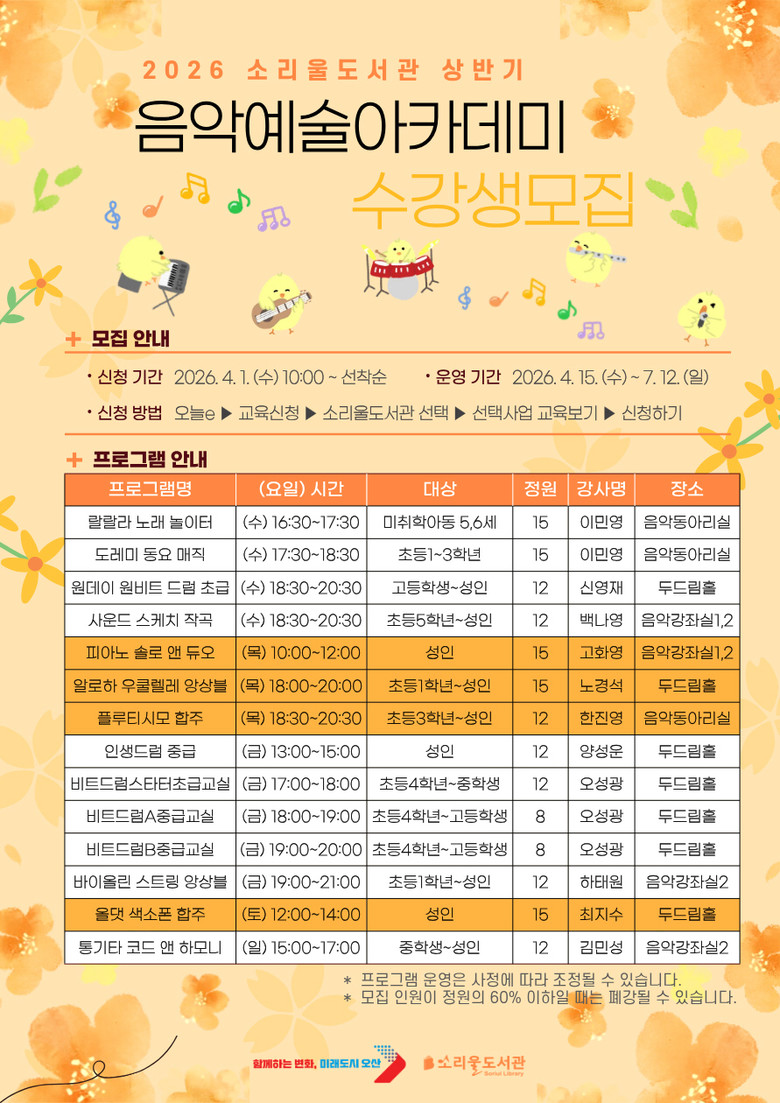 한편, 각 프로그램은 정원의 60% 미만 모집 시 폐강될 수 있으며, 운영 일정은 도서관 사정에 따라 일부 변경될 수 있다. 자세한 사항은 오산시 교육포털 홈페이지 또는 소리울도서관(031-8036-6674)으로 문의하면 안내받을 수 있다.
