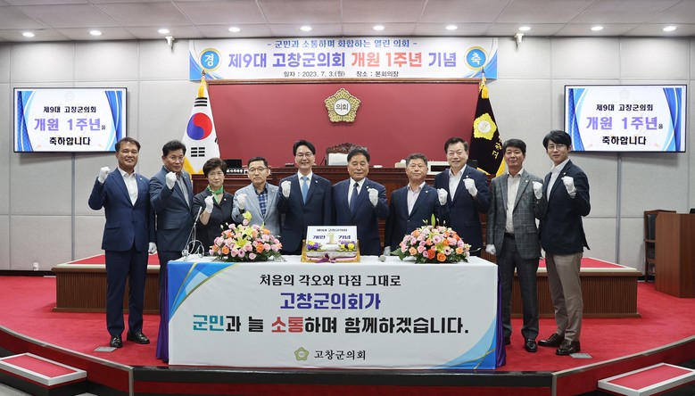 기념에 앞서 의원들은 1층 소회의실에서 월례 의원 간담회를 갖으며 지난 1년간 고창군의회의 성과와 발자취를 되돌아보는『개원 1주년 기념, 의정활동 영상』을 시청했다. 그리고 쉼 없이, 소중하게 활동해 온 영상 속 장면 하나 하나를 떠올리며 군민과 함께한 지난 시간에 대한 소회와 새로운 각오를 다졌다.