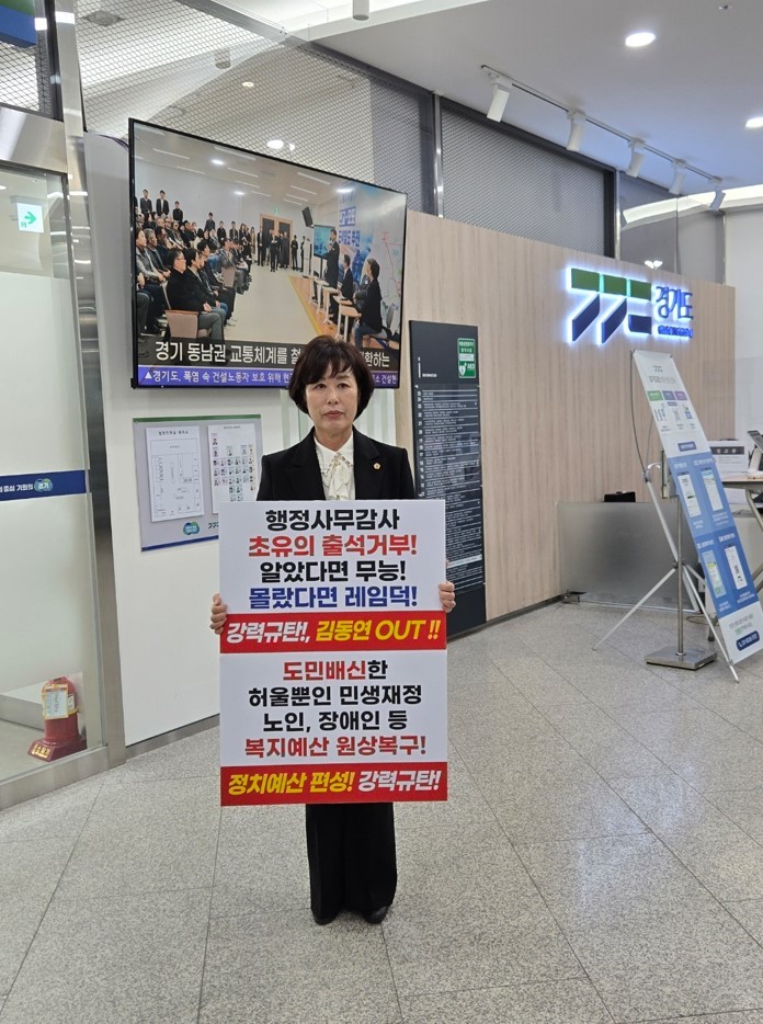 [경기도 세계타임즈=송민수 기자] 경기도의회 운영위원회 소속 이채영 의원(국민의힘, 비례)은 20일, 경기도지사 비서실장을 비롯한 보좌진의 연이은 불출석으로 경기도의회 운영위원회 행정사무감사가 이틀째 파행된 상황을 규탄하며 경기도청 1층 열린민원실 앞에서 4인 릴레이 1인 시위에 나섰다.
