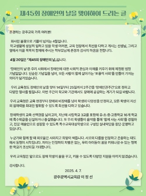 이정선 교육감은 “장애 인권 주간을 맞아 서로의 다름을 이해하고, 누구나 존중받는 세상을 생각해 보는 시간이 되길 바란다”며 “우리 아이들이 ‘행복을 바라보고, 평범한 일상 속 따뜻한 마음을 나누며, 서로의 희망을 이어가는 세상’을 만들어가길 기대한다”고 말했다.