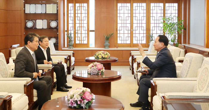 [울산=세계타임즈 이호근 기자] 울산시의회 황세영 의장은 5월 10일 오전, 울산상공회의소 전영도 회장을 만나 “대우조선해양 인수로 현대중공업 물적분할에 따른 실질적인 본사가 되는 한국조선해양을 서울로 이전하는 사안”에 대해 대책을 논의했다.