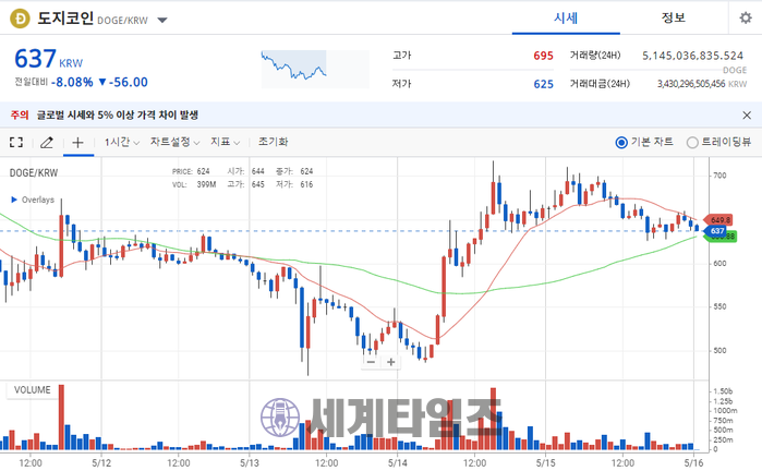 | ▲업비트 2021년05월16일 00시12분 현재 도지코인 시세표 |