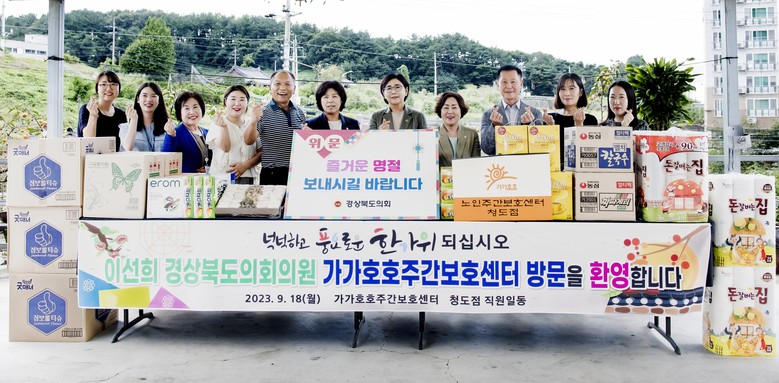 [경북 세계타임즈=한성국 기자] 경상북도의회 이선희 도의원은 18일(월) 추석을 앞두고 청도군 화양읍에 소재한 가가호호주간보호센터를 방문해 위문품을 전달하며 어려운 이웃들과 함께 따뜻한 명절의 온정을 나눴다.
