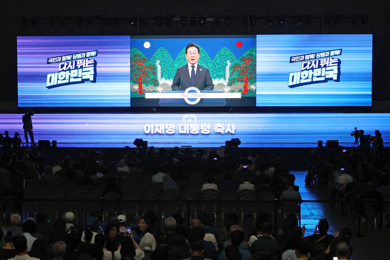 2일 고양 킨텍스에서 열린 더불어민주당 전국당원대회 개회식에서 이재명 대통령의 영상 축사가 상영되고 있다. 2025.8.2