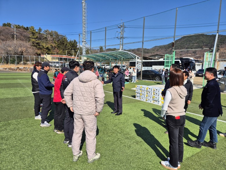 [하동군 세계타임즈=최성룡 기자] 지난 28일, 하동군산림조합(조합장 정철수), 하동군과 하동군체육회는 경기력 향상을 위해 하동군을 찾은 초등부 8팀 축구선수들의 동계 전지훈련 현장을 방문해 격려품을 전달하고 훈련 현장을 점검했다.