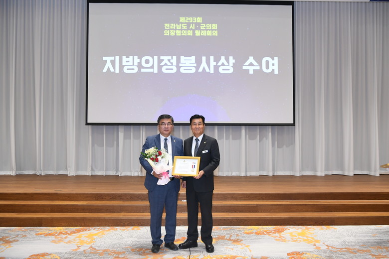 이날 회의는 △재직기념패 시상식 △대한민국 지방의정봉사상 시상식 △전라남도 의정봉사대상 시상 및 감사패 전달 △주요안건 논의 및 의결 순으로 진행됐다.