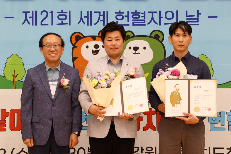| ▲ 김용래 도의원(가운데)이 대한적십자사회장 표창장을 다.(사진제공:강원특별자치도의회) |