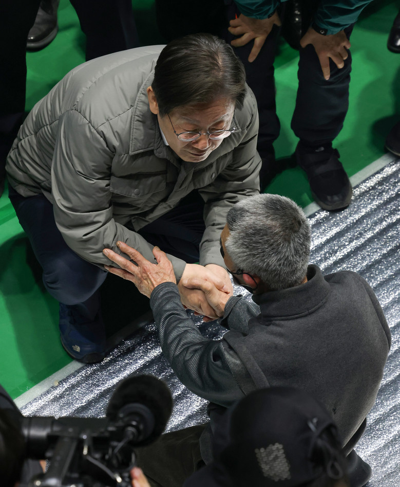 [세계타임즈 = 심귀영 기자] 더불어민주당 이재명 대표가 26일 오후 경북 안동시 안동체육관에 마련된 산불 대피시설을 찾아 이재민을 위로하고 있다. 이 대표는 이날 공직선거법위반 혐의 항소심 무죄 선고 후 첫 일정으로 이곳을 찾았다. 2025.3.26 [공동취재]