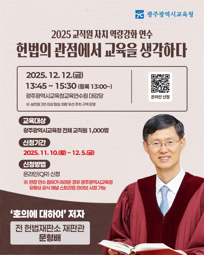 문 전 재판관의 강연은 시교육청 공식 유튜브 채널(https://www.youtube.com/@gwangjuedu)에서 생중계된다.